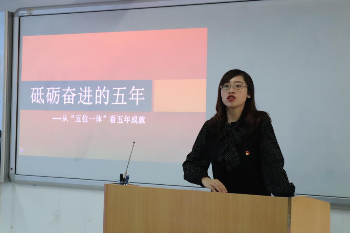 2018年12月20日,禁漫 衣翠翠老师为2018级法学专业的106位学生开展砥砺奋斗的五年——从“五位一体”看五年成就的讲座,从政治、经济、文化、社会、生态五个方面切入,使同学们对党的十八大以来的五年所取得的成就有了更加全面、深入的认识,同学们都表示收获颇多。
