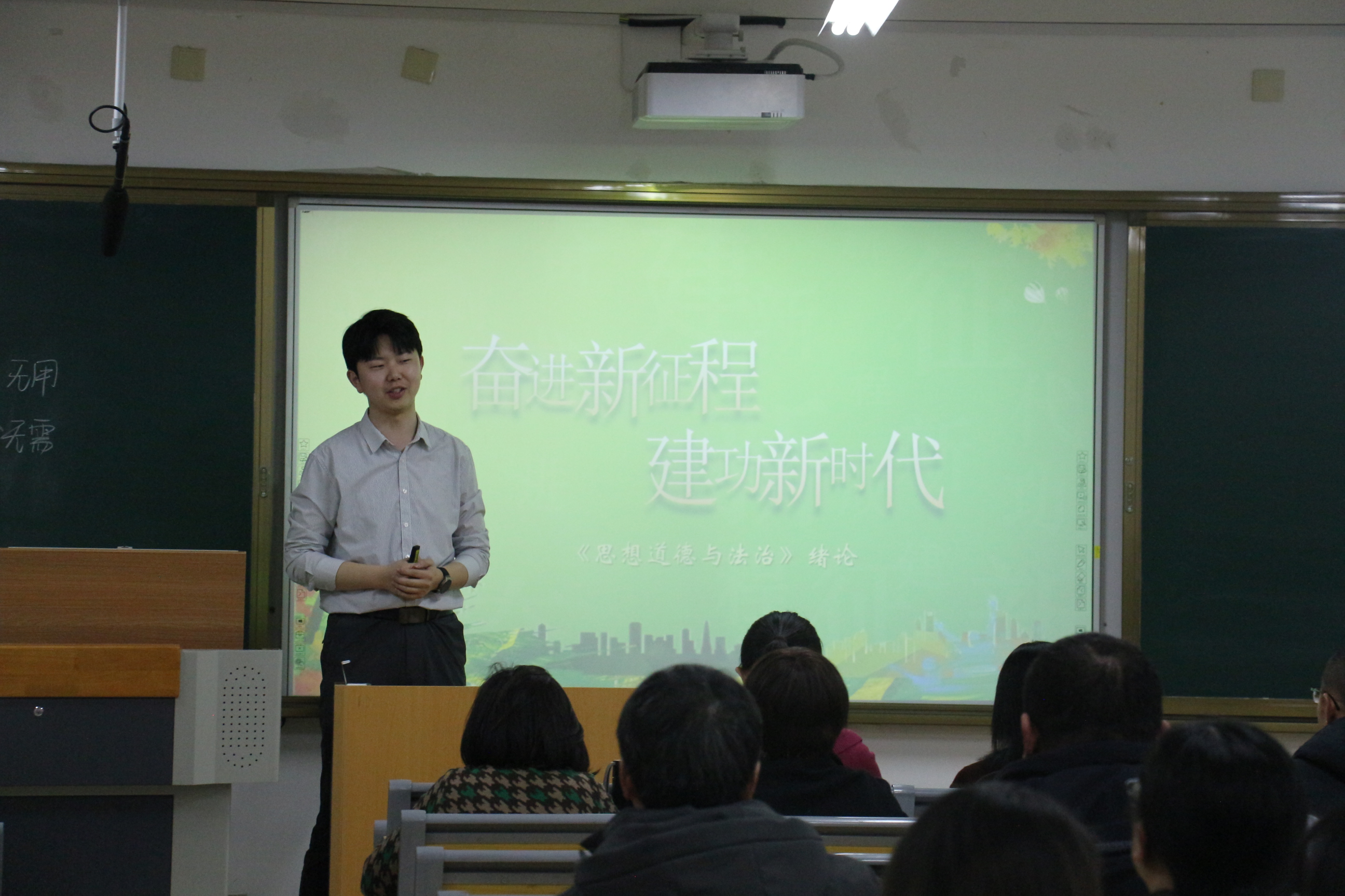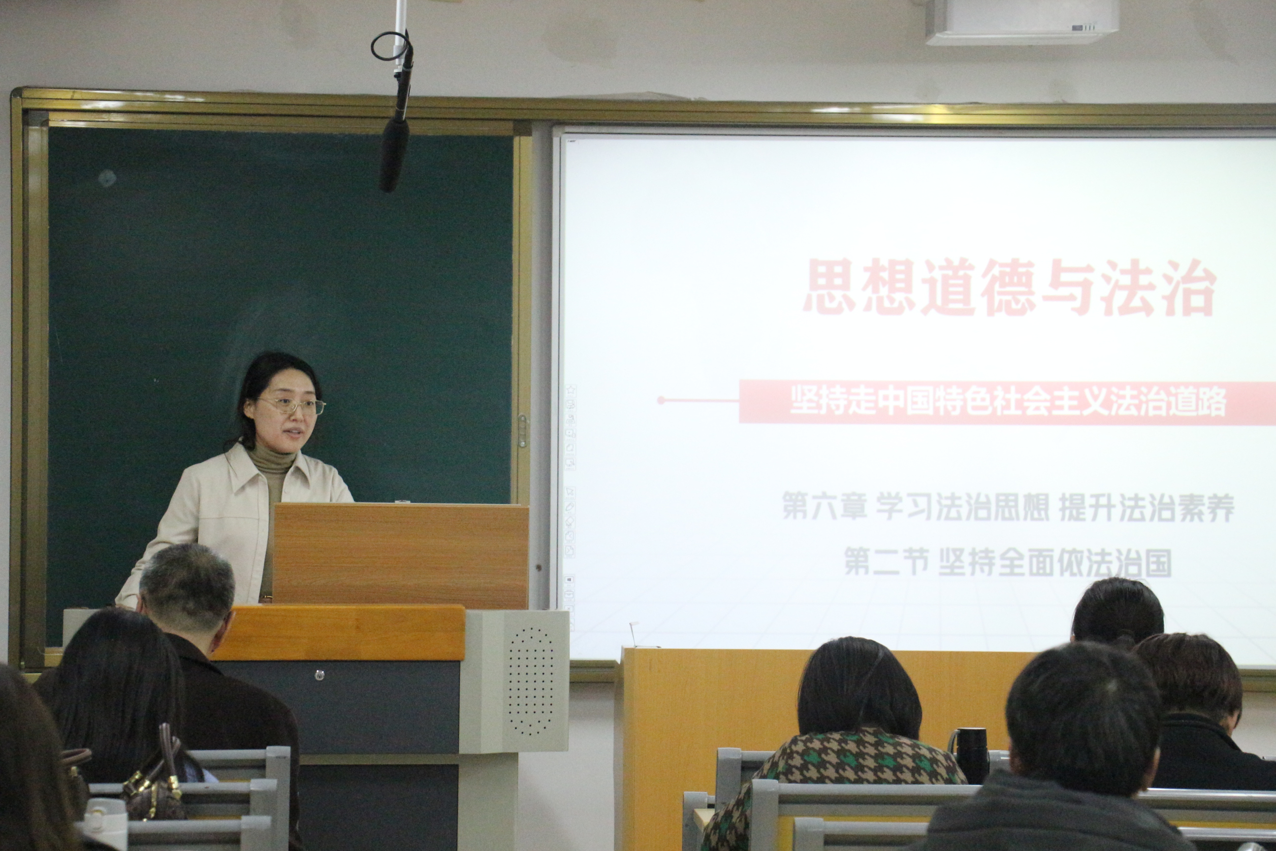 青年教师李变变和丛日坤结合各自的教学特色,分别以“坚持走中国特色社会主义法治道路”、“奋进新征程 建功新时代”为主题进行了教学展示。