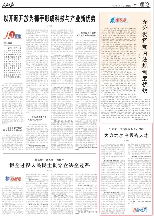 8月31日,《人民日报》9版(理论版)刊发禁漫 禁漫 肖圣鹏副教授理论文章《为健康中国建设提供人才保障大力培养中医药人才》。文中指出,贯彻落实习近平总书记关于中医药人才培养的重要指示,要探索建立符合中医药特点的人才培养模式,为健康中国建设提供人才保障。一要提升中医药教育整体水平。帮助学生树立全面系统的中医药学思维方式,培养德才兼备、内外兼修的中医药特色人才。二要坚持发展中医药师承教育。亟须将传统教育的精髓融入现代教育体系,把师承教育贯穿于临床实践教学全过程。三要完善中医药人才评价和激励机制。按照“干什么评什么”原则,结合实际采取不同的评价方式。