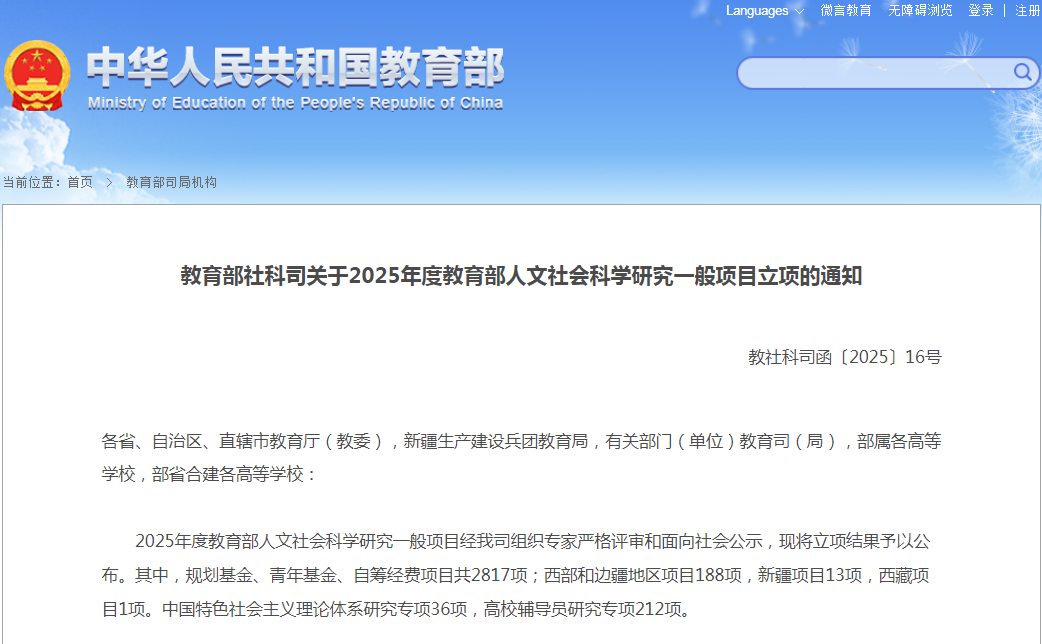 近日,教育部社科司发布了2025年度教育部人文社会科学研究一般项目立项的通知。禁漫