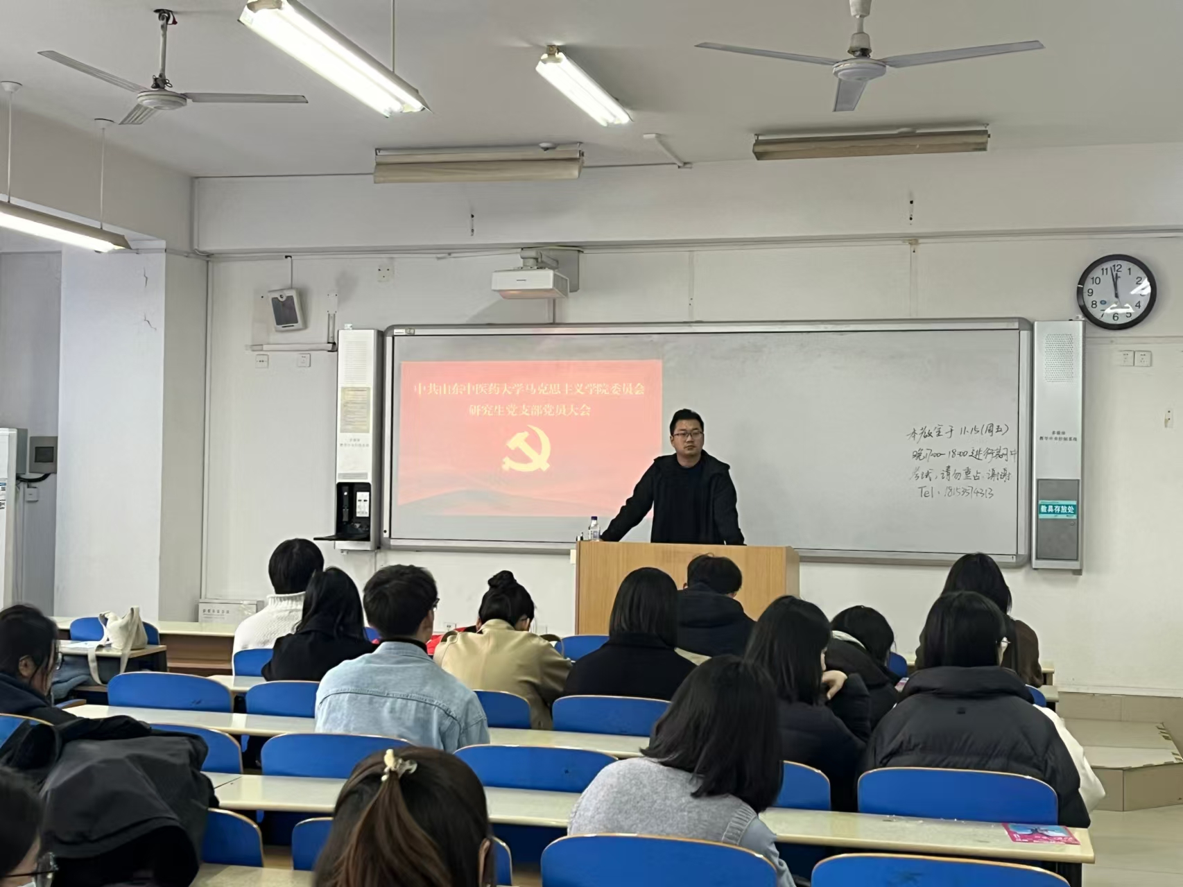 党委研究生党支部在一号教学楼108室召开支部大会讨论接收预备党员事宜。本次会议由党支部书记李岩磊主持,支部全体党员参加。