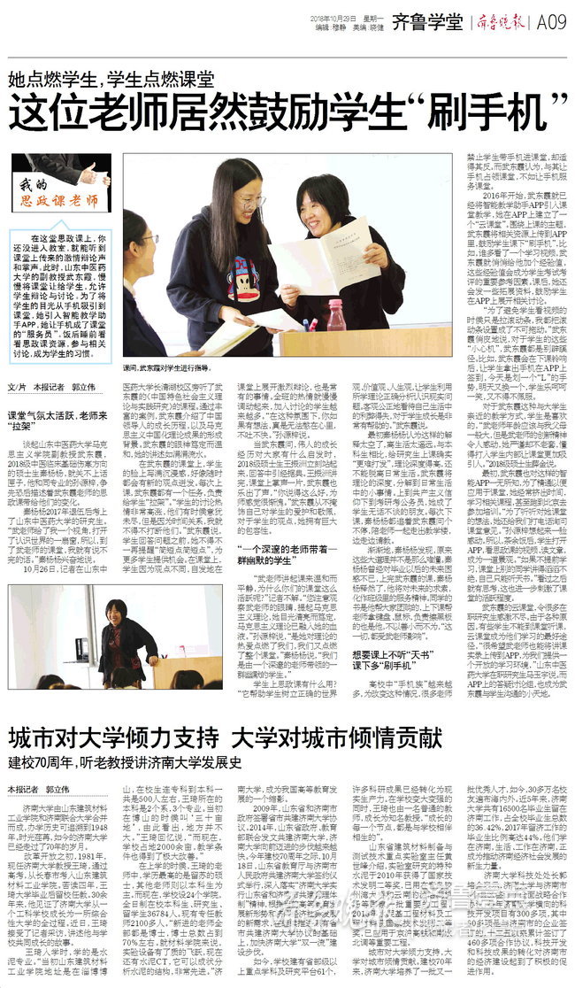 的副教授武东霞,就慢慢将课堂让给学生,允许学生辩论与讨论。为了将学生的目光从手机吸引到课堂,她让手机成了课堂的“服务员”。引入智能教学助手APP,她让手机成了课堂的“服务员”,饭后睡前看看思政课资源,参与相关讨论,成为学生的习惯。