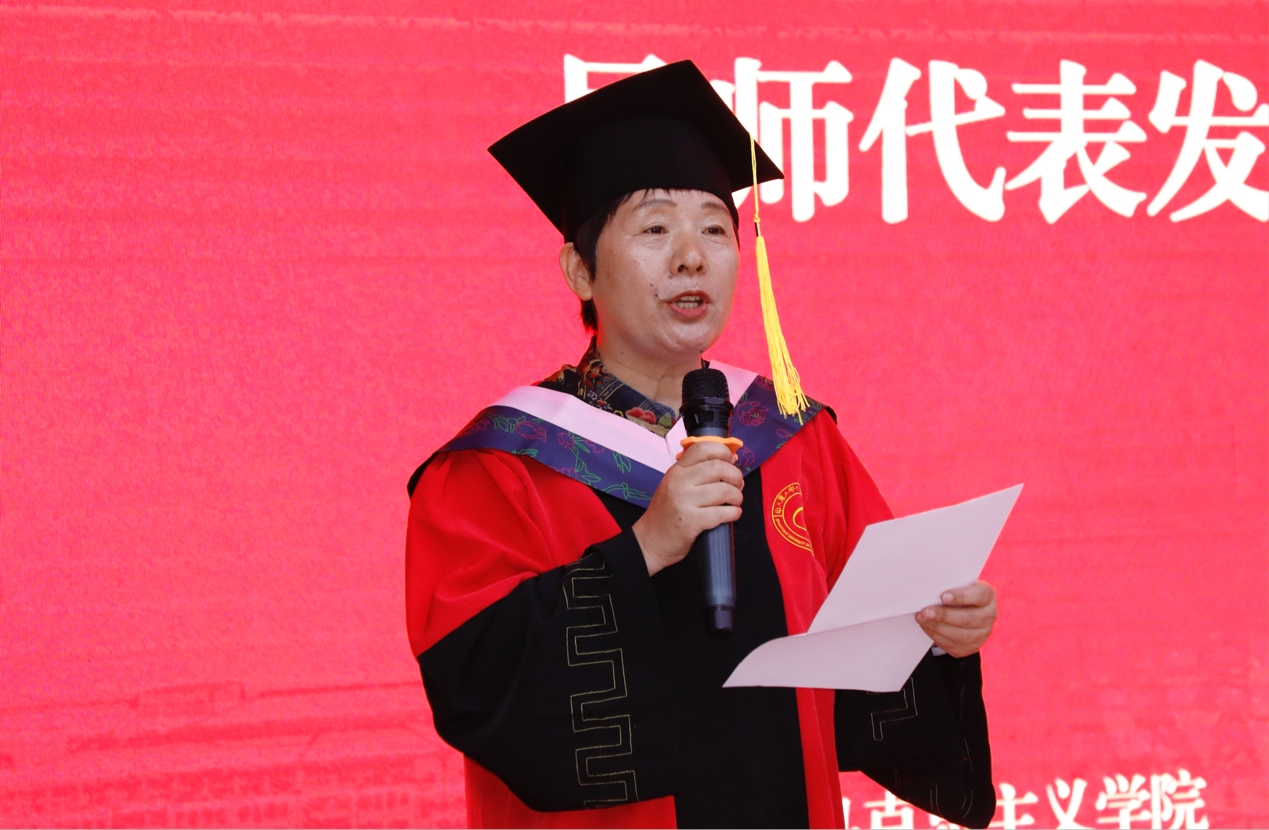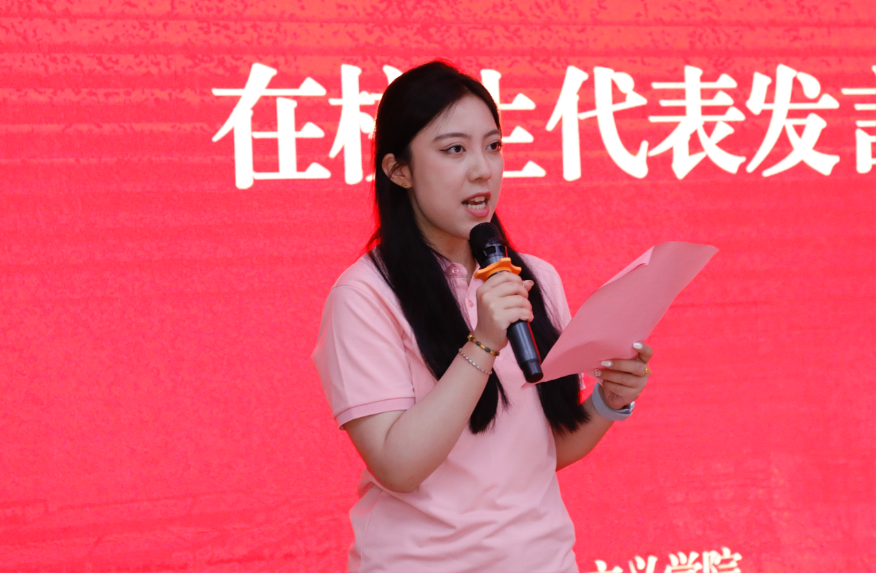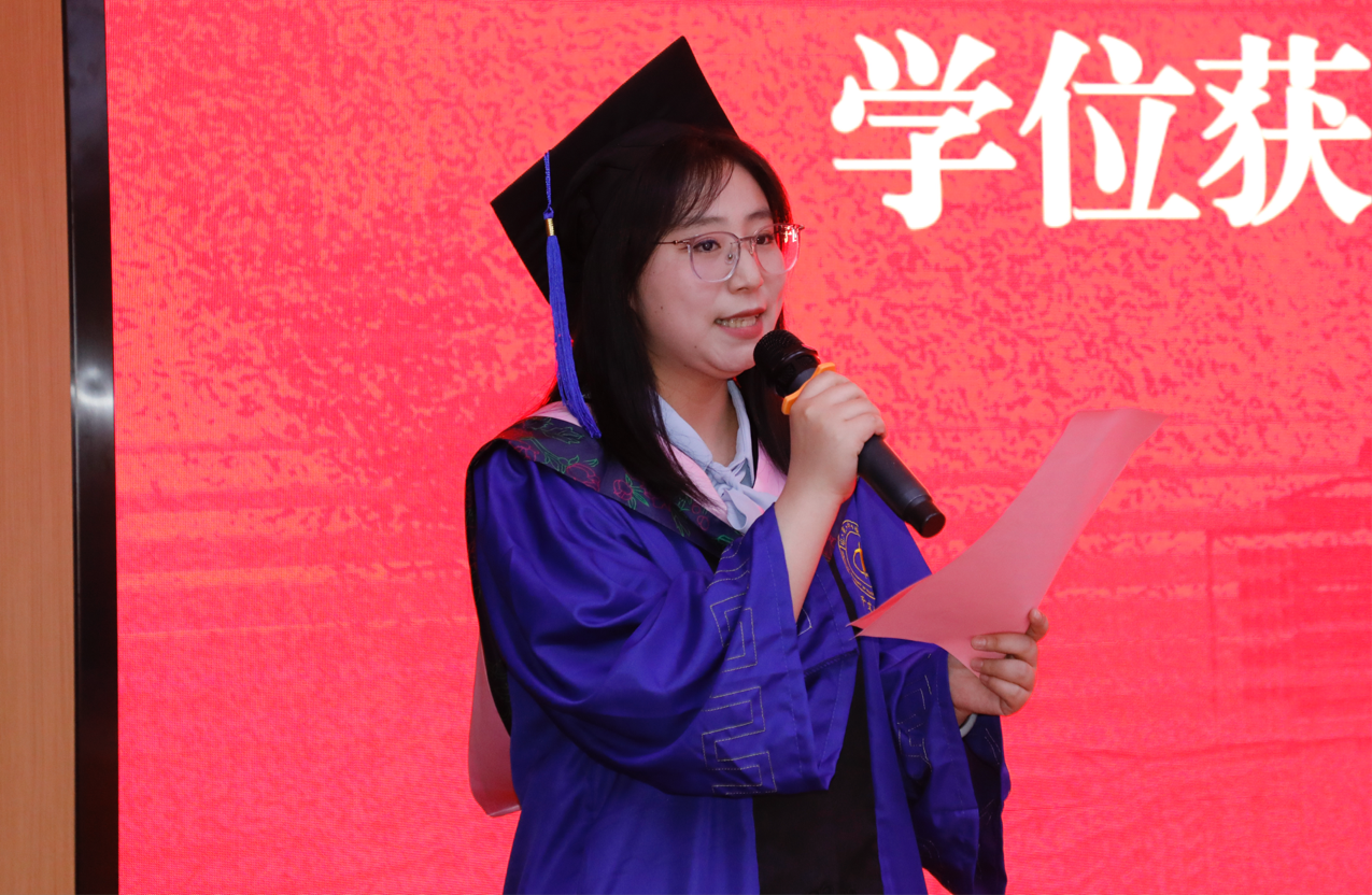 活动中,毕业生导师代表武东霞发言时深情回顾了与同学们的点点滴滴,并寄予殷殷祝福;学位获得者代表于文斐以真挚的语言分享了求学感悟,表达了对母校的感恩与对未来的憧憬;在校生代表张潇艺用满怀敬意的话语,代表全体在校生为学长学姐们送上诚挚祝福,传递出“青春接力”的深意。